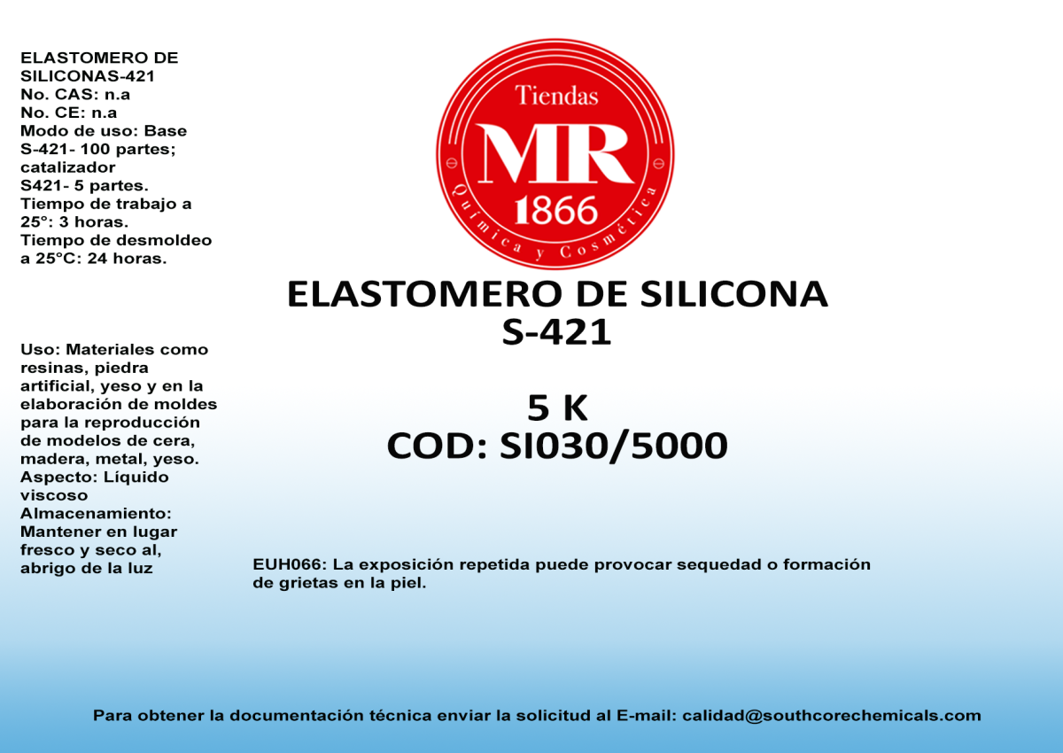 El S-421 es un elastómero de silicona en 2 componentes, que mezclados a temperatura ambiente, reticulan, obteniendo un producto final flexible, elástico y de excelentes propiedades mecánicas.