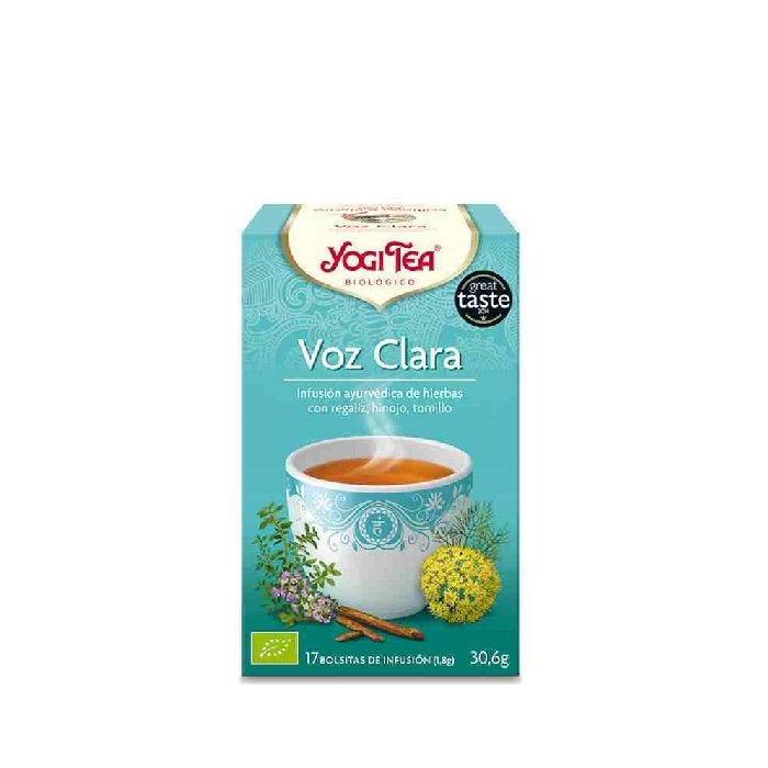 Infusión Yogi Tea que integra plantas para proteger la salud de las cuerdas vocales específicamente. Yogi Tea Voz Clara incorpora regaliz, hinojo, tomillo para prevenir infecciones de laringe.